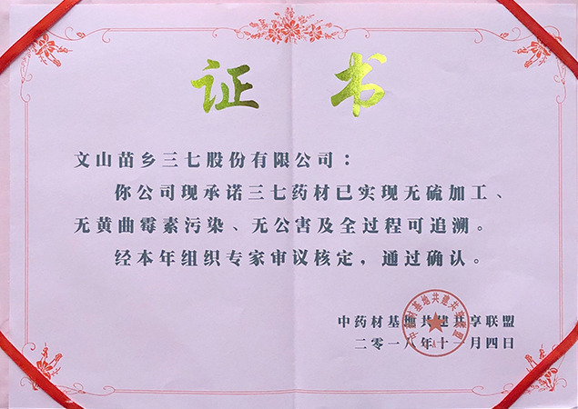 ? ? ? ?2018年11月3日,由中藥材基地共建共享聯(lián)盟主辦的第六屆中藥材基地共建共享聯(lián)盟交流大會(huì)于廣州舉辦,因苗鄉(xiāng)三七嚴(yán)格遵循無(wú)公害標(biāo)準(zhǔn),打造全產(chǎn)業(yè)鏈質(zhì)控及追溯體系,獲評(píng)為全國(guó)首批中藥材“三無(wú)一全”品牌基地,即無(wú)公害藥材生產(chǎn)、無(wú)硫加工、無(wú)黃曲霉素污染、全程可控可追溯,為三七品類的唯一獲評(píng)者。