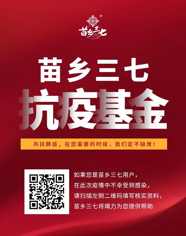向防治疫情前線捐贈(zèng)價(jià)值87萬(wàn)元三七產(chǎn)品的同時(shí),苗鄉(xiāng)三七成立150萬(wàn)元抗疫基金,將為此次疫情中不幸感染的苗鄉(xiāng)三七用戶提供專(zhuān)項(xiàng)幫助!