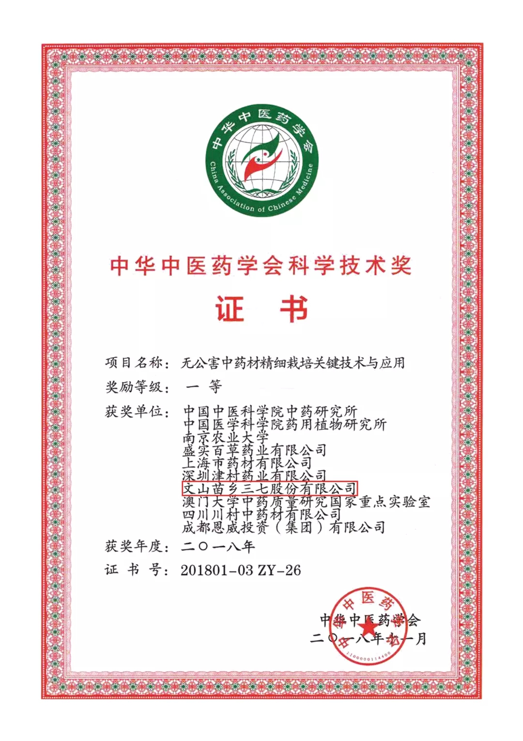 苗鄉(xiāng)三七榮獲中華中醫(yī)藥學(xué)會(huì)科學(xué)技術(shù)一等獎(jiǎng)