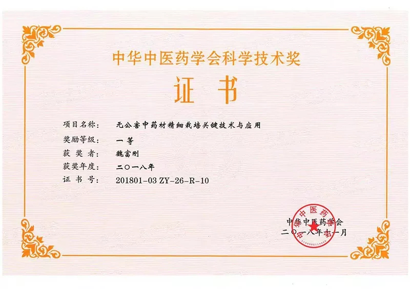 ? ? ? 2018年11月25日,苗鄉(xiāng)三七與中國(guó)中醫(yī)科學(xué)院中藥研究所等單位共同開(kāi)展的“無(wú)公害中藥材精細(xì)栽培關(guān)鍵技術(shù)與應(yīng)用”項(xiàng)目榮獲中華中醫(yī)藥學(xué)會(huì)科學(xué)技術(shù)一等獎(jiǎng),苗鄉(xiāng)三七科技公司總經(jīng)理魏富剛獲個(gè)人一等獎(jiǎng)。