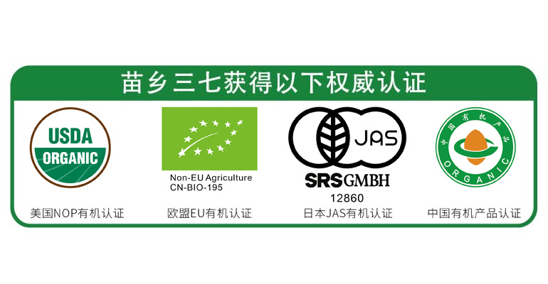 自2001年起,苗鄉(xiāng)三七相繼并持續(xù)獲得日本JAS有機認證、中國有機產(chǎn)品認證,成為目前市場上高品質(zhì)三七品牌代表。